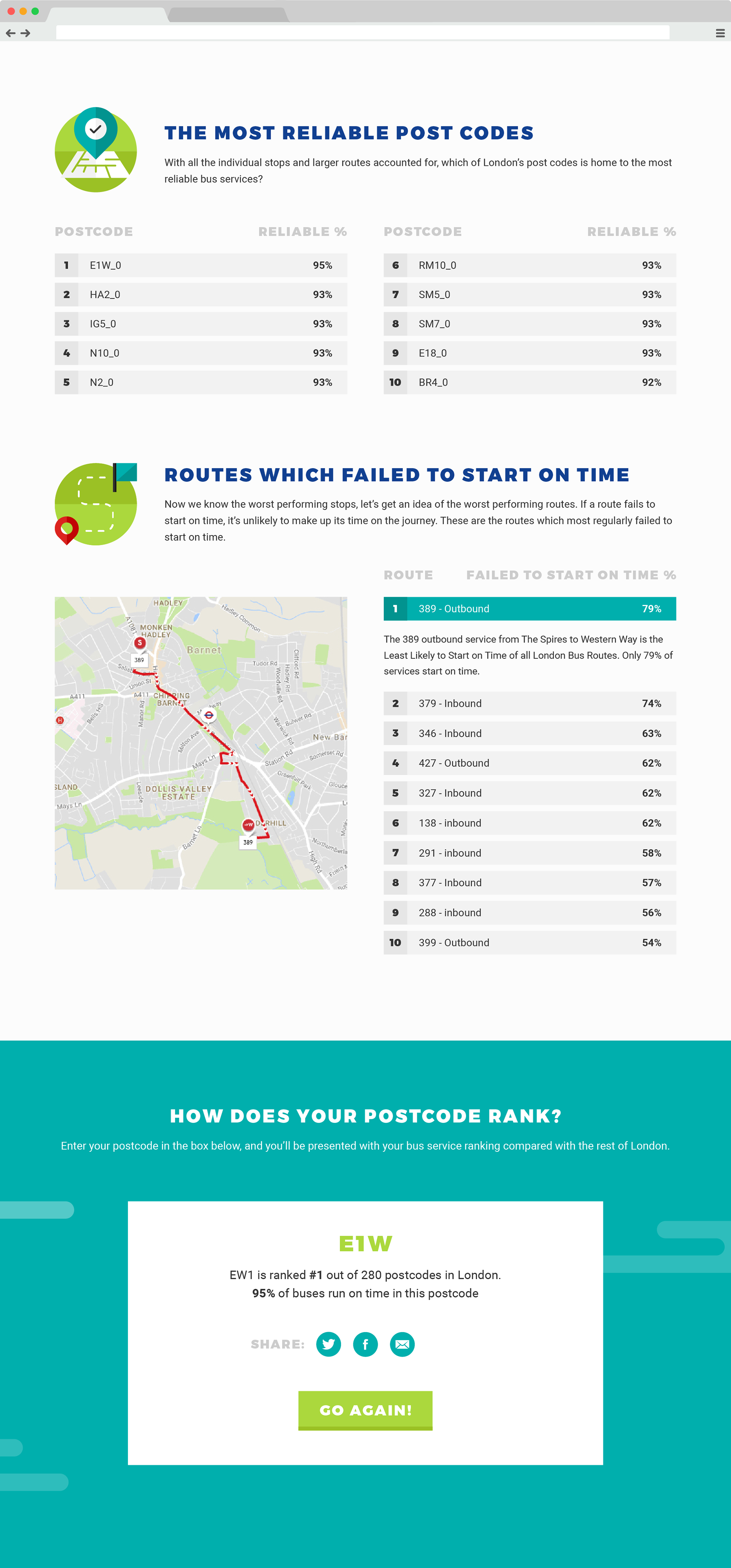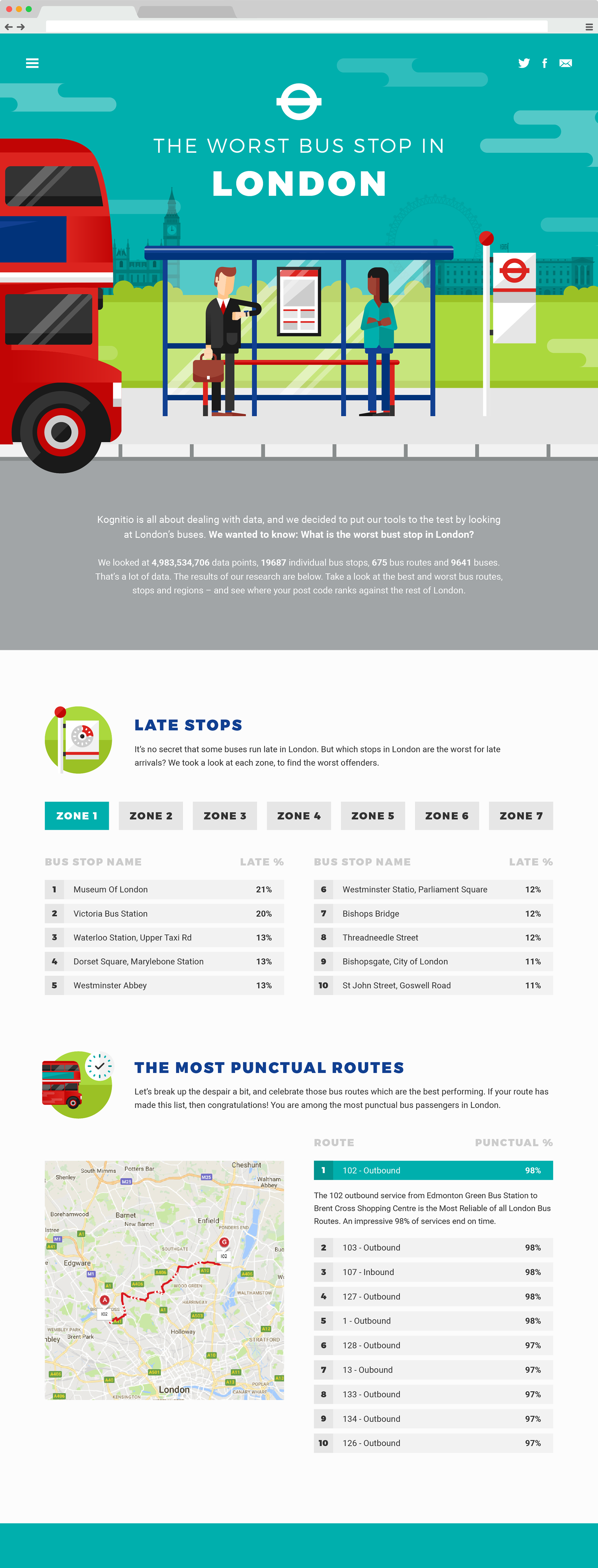 A web page designed for Kognitio which reveals the worst bus stops in London. After viewing the data, the user has the option to enter in their postcode and see you how their local bus service compares with the rest of London.
