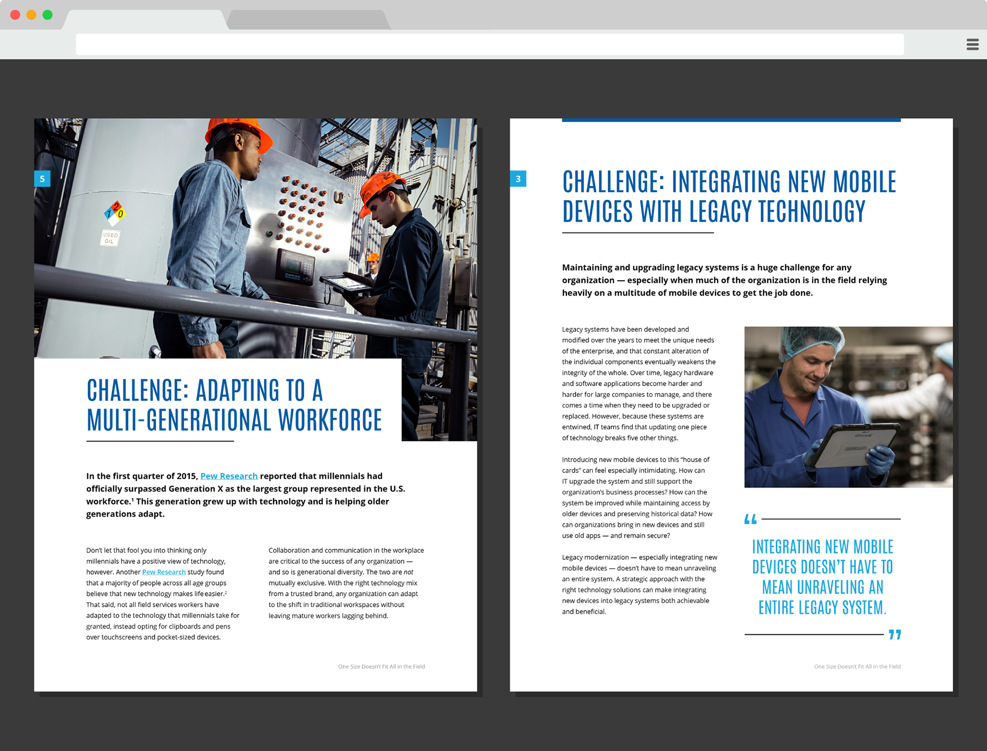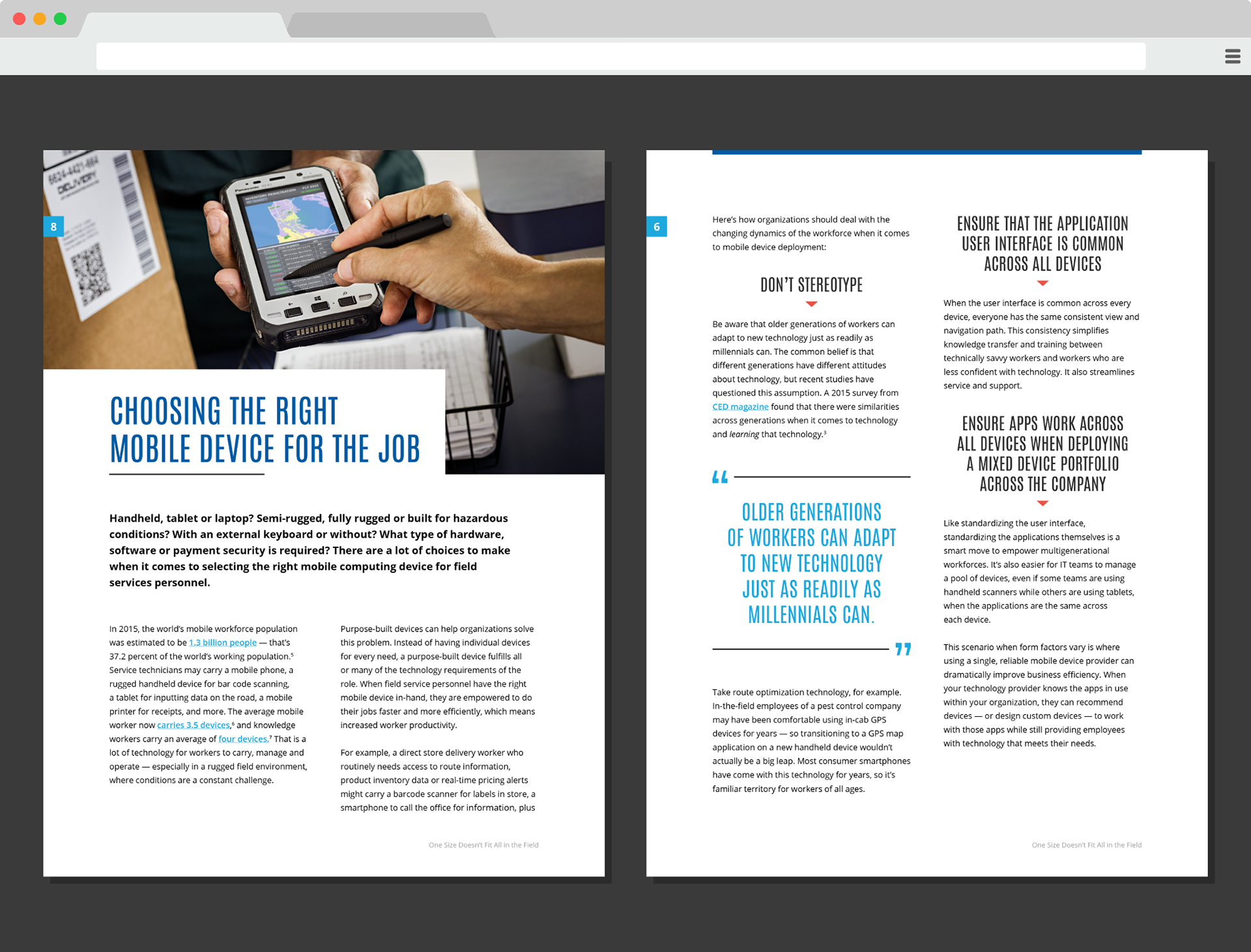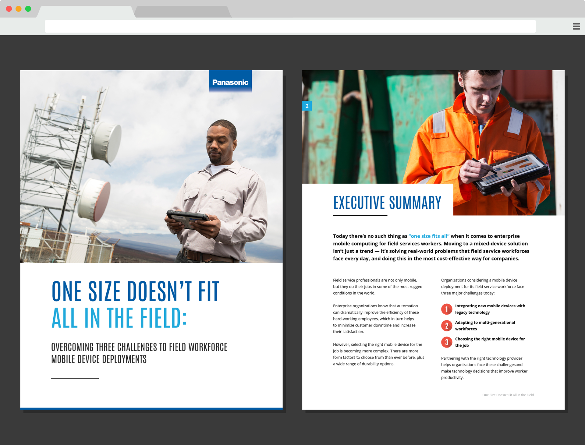 Selected pages from a white paper designed for Panasonic. The white paper examines the three challenges to field workforce mobile deployments and explains how to overcome them.